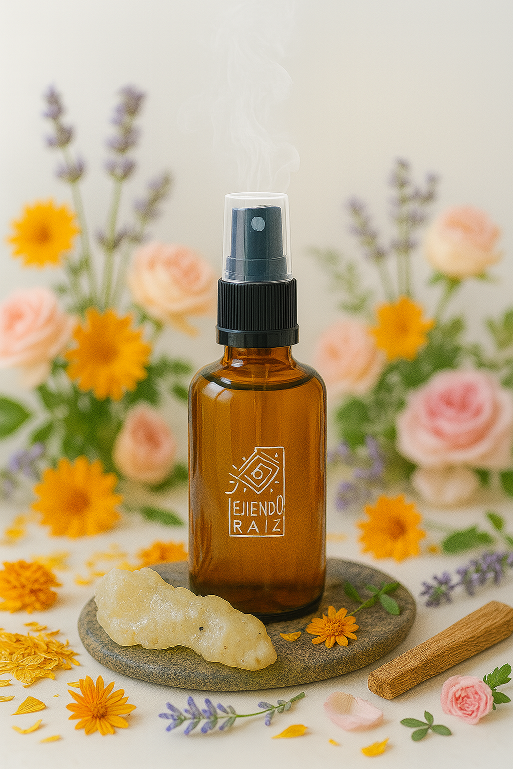Es un agua sagrada elaborada con flores rezadas, usada tradicionalmente por chamanes y terapeutas para armonizar el campo energético. Representa el estado de conciencia más alto de la planta: la flor. En Tejiendo Raíz la preparamos artesanalmente con fórmulas ancestrales, dejándola madurar en oscuridad para potenciar su vibración.